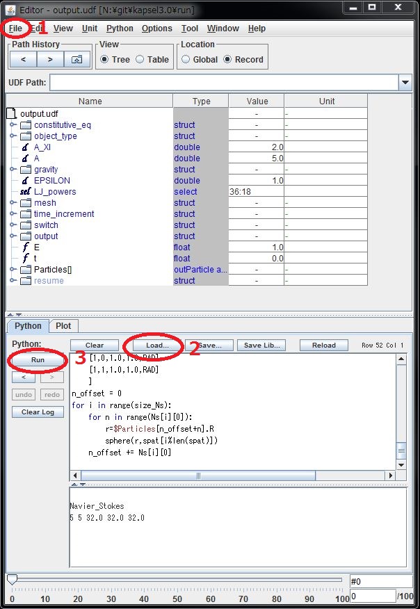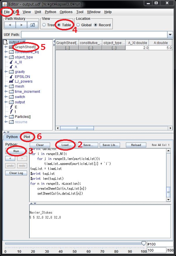 The history of simulation run (instantaneous positions and velocities of particles) is stored in "output.udf". One can access to this file by one of the following methods.